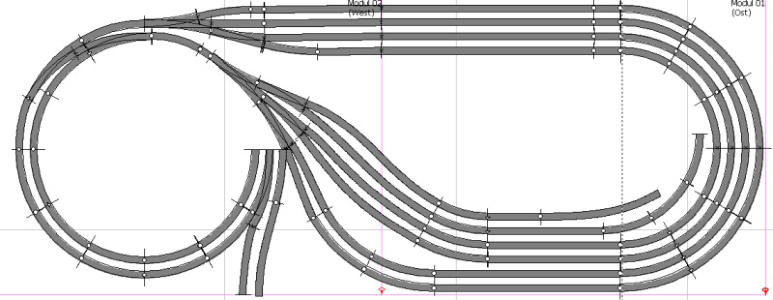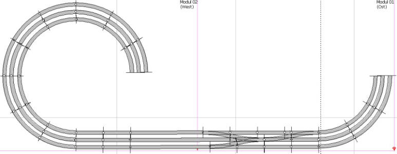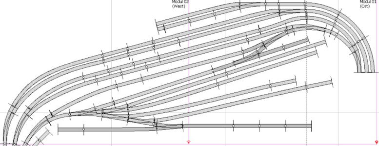Der Gleisplan ist in 3 Ebenen aufgeteilt, die direkt übereinander liegen•Bahnhof Schattwald (Schattenbahnhof)•Wendel und Auffahrrampe•Bahnhof Lärchensee (sichtbarer Bereich)Der Bauabschnitt 1 ist aktuell in Arbeit (Beginn 2002) und beinhaltet das hier gezeigte.Der folgende Bauabschnitt 2 wird eine Paradestrecke, einen Endbahnhof der Nebenbahn und einen weiteren Schattenbahnhof enthalten. Damit ergibt sich später ein verschlungener “Hundeknochen” mit weitläufigem Kreisverkehr für die Hauptstrecke.Gleisplan SchattwaldSchattwald bildet eine große Kehrschleife. Züge können vom Bahnhof Lärchensee nach Schattwald fahren und kommen von dort wieder zurück. Lärchensee ist in der aktuellen 1. Ausbaustufe ein Endbahnhof.Die Gleislänge einer solchen Fahrt beträgt ca. 29 Meter, bei 70 km/h (Modellgeschwindigkeit H0) benötigt ein Zug in etwa 2 Minuten und 10 Sekunden.Züge fahren im Rechtsverkehr an der Wendel-Innenseite nach unten.Es gibt vier Durchfahrtsgleise, die in je zwei Blöcke eingeteilt sind. Dort können acht Garnituren stehen.Zwei Stumpfgleise können Wendezüge aufnehmen.Im Ein- und Ausfahrbereich gibt es eine Querverbindung, damit können die Wendezüge das aufwärts führende Gleis erreichen.Der erste Block der Rampe Richtung Lärchensee ist mit einem elektronischen Kehrschleifenmodul auf Kurzschluss-Basis ausgerüstet.Im BH-Lärchensee herrscht damit auf allen Gleisen gleiche Polarität.Die zwei Gleisstummel sind in Richtung Bauabschnitt 2 gerichtet: 1 x Nebenbahn, 1 x nicht näher verplante Anschlussmöglichkeit.Gleisplan Rampe 1Die Gleiswendel besteht aus 11/2 Umdrehungen, anschließend ein gerades Stück mit dem Weichenvorfeld der Bahnhofseinfahrt.Die gesamte Rampe ist wie der SBH nicht sichtbar.Das dritte Gleis ist die Nebenbahn. Es gibt nur eine Verbindung zur restlichen Strecke.Schattwald und Lärchensee haben einen Höhenabstand von 27 cm.Gleisplan Bahnhof LärchenseeDer Bahnhof Lärchensee erstreckt sich schräg über beide Segmente. Ganz oben sind die zwei Stumpfgleise der Nebenbahn.Es folgen fünf Gleise für den Durchgangsverkehr der Hauptbahn mit Bahnsteigen.Als nächstes drei Gleise als Abstellgruppe. Das erste davon kann aber auch für Rangierfahrten benutzt werden. Das dritte erhält am rechten Ende eine Rampe für die RoLa (rollende Landstraße = LKW Verladung).Die nächsten zwei Gleise führen zum Güterschuppen.Das Gleis unten links bekommt eine kleine Dieseltankstelle und kann als Abstellgleis für Loks benutzt werden.Die Gleisstummel ganz links unten führen später in den 2. Bauabschnitt (zwei Streckengleise, ein Ausziehgleis und ein Abstellgleis für Rangierloks).